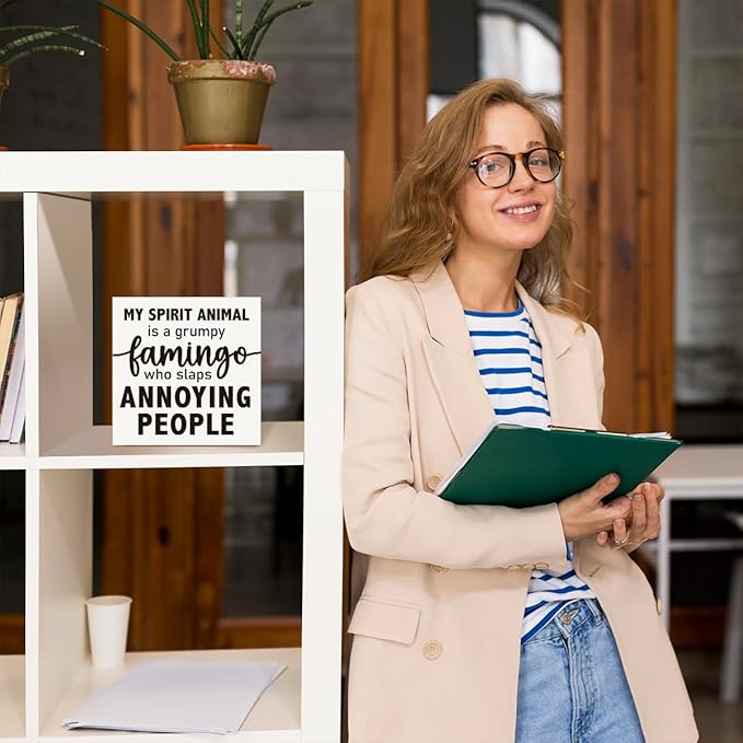 Funny Office Wood Box Sign - "Grumpy Flamingo Spirit" Wooden Block Sign, 5x5x1 Inch Whimsical Desk Decor for Sassy Female Professionals