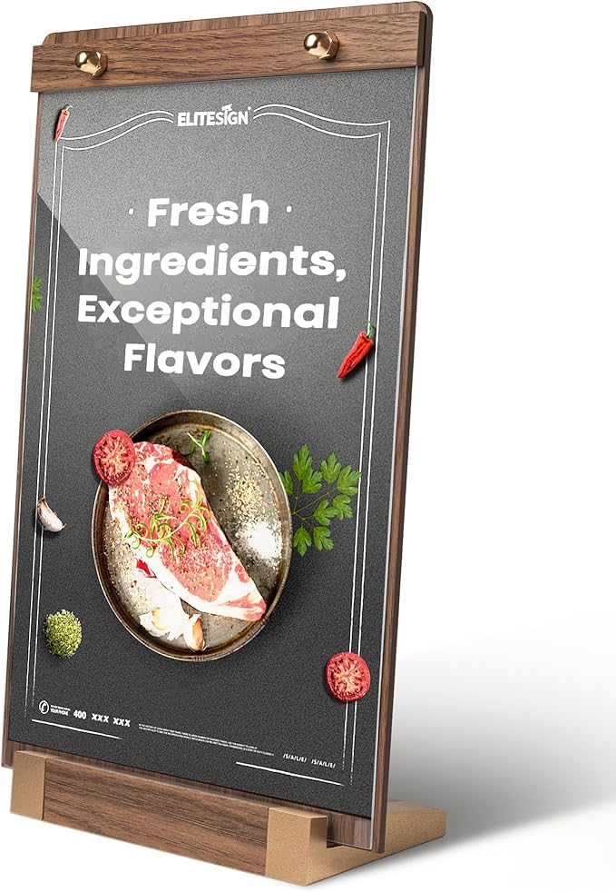 - Premium Walnut Wood & Acrylic Design: Menu holder is carefully crafted with sturdy and wear-resistant walnut and high-transparency acrylic materials, plastic sign holders with a stylish and elegant appearance and clear display effect. The protective film ensures no scratches (please tear off before use).