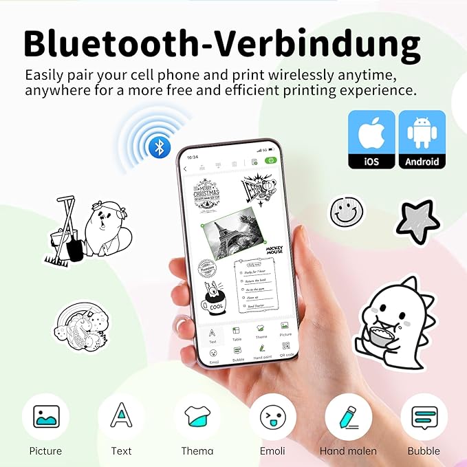 - Small & Compact Design: Our mini thermal sticker printer is a portable and compact wireless printers, with bluetooth printer for iPhone and Android compatibility, perfect for student, professional, and DIY lover. Easily carry this small printer in your bag or pocket to print study notes, label, or to-do list anytime, anywhere