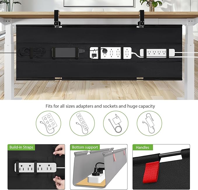 - [Large Capacity] - With the KEEGH no drill cable management under desk, featuring an 28-inch size to accommodate all your power extensions, adapters, extra wires, power strips, power banks, chargers and more. Keep your workspace tidy and organized. Say goodbye to visible cords with the revolutionary fabric material that completely hides all wires for a clutter-free look!