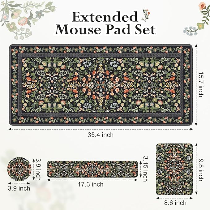 - Desk Mat Set Dimension: The extra large mouse pad 35.4" x 15.7", ergonomic keyboard pad 17.32" x 3.15" , wrist support mouse pad 10.6" x 8.8" , coaster:3.93" x 3.93". Great size providing comfort and plenty of space for gaming or office work