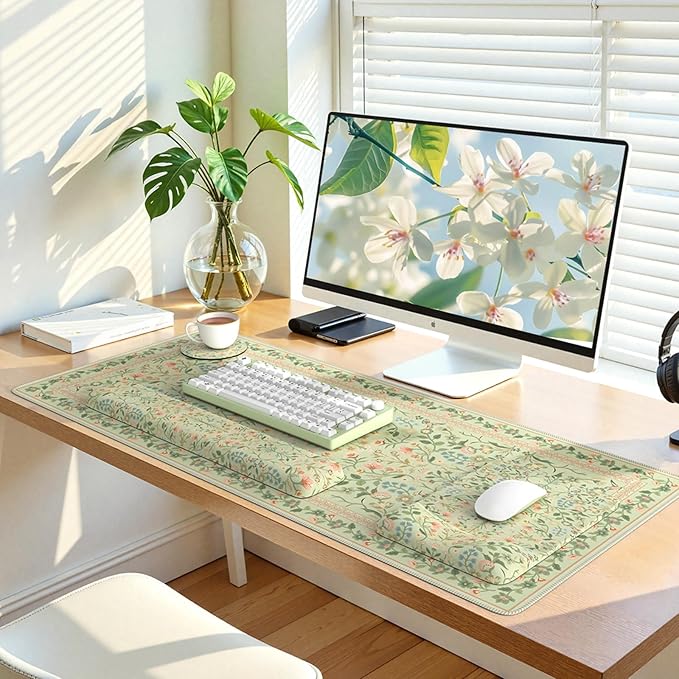 iLeadon Mouse Pad with Wrist Rest, Non-Slip Desk Mat for Keyboard and Mouse, Mouse Pad Sets for Women Desk, Wrist Pads for Keyboard, Floral Mat for Home Office (Light Green)
