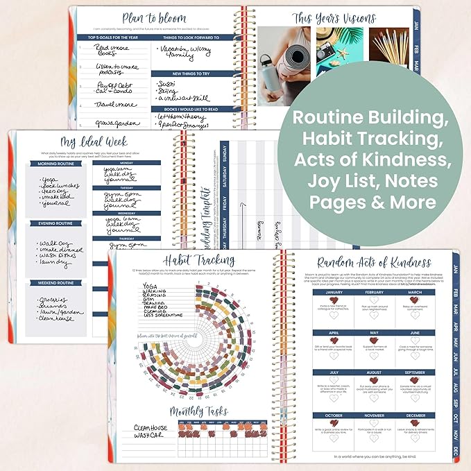 - BONUS ELEMENTS: Packed with life coaching worksheets and inspirational features to help you set and achieve all of your goals for the year: personal mission statement prompt and yearly goal setting page, weekly scheduling template, values page, habit tracking, vision board, monthly spending log, 12 notes pages, inspirational quotes, monthly challenges, and more!