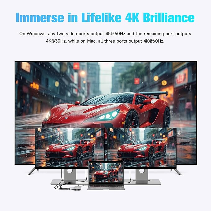 - Triple 4K Monitors Docking Station: Boost productivity or entertainment with USB C docking station triple-monitor setups! Connect up to 3 external displays via Dual HDMI and DisplayPort at 4K@60Hz resolution, delivering crisp, lag-free visuals. Ideal for multitasking, video editing, or creative workflows