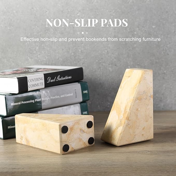 - 【Stable & Durable】Made of natural solid marble, weighing up to 7 pounds to support heavy duty books. The four extra non-slip stickers can better prevent the bookends from sliding and protect the furniture, which provides higher weight capacity and safety than plastic bookends