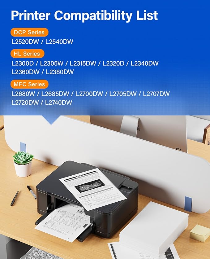 - Compatible Printer: Compatible with Brother DCP-L2520DW, DCP-L2540DW, HL-L2300D, HL-L2305W, HL-L2315DW, HL-L2320D, HL-L2340DW, HL-L2360DW, HL-L2380DW, MFC-L2680W, MFC-L2685DW,MFC-L2700DW, MFC-L2705DW, MFC-L2707DW, MFC-L2720DW, MFC-L2740DW (Please check that your printer model matches the printer model of this toner cartridge before placing an order)