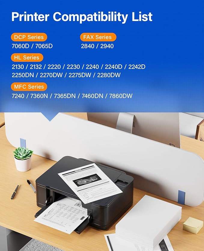 - Compatible Printer: Compatible with Brother DCP-7060D, DCP-7065D, HL-2130, HL-2132, HL-2220, HL-2230, HL-2240, HL-2240D HL-2242D, HL-2250DN, HL-2270DW, HL-2275DW, HL-2280DW, Intellifax 2840, Intellifax 2940, MFC-7240, MFC-7360N, MFC-7365DN MFC-7460DN, MFC-7860DW (Please check that your printer model matches the printer model of this toner cartridge before placing an order)