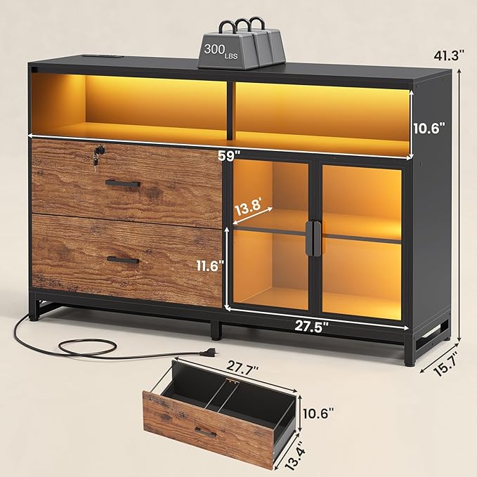 - 📁【What Can You Get?】 The file cabinet has 2 file drawers with 1 lock for Legal, Letter, A4 sizes standard file, power strip for charging 4 devices at the same time, spacious desktop(59"L) large enough for printers and scanners, 4 storage shelves, a pair of acrylic cabinet door for protecte documents and LED light. Filing cabinet that can be combined with any computer desk to form an L-shaped office area.