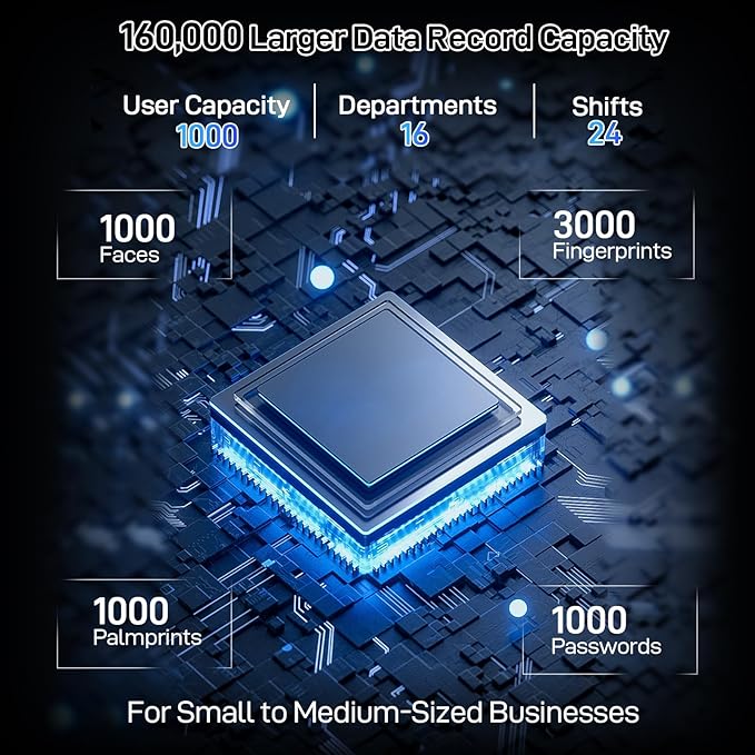 - ✨4 In 1 Punch Time Clock Machine: KUIIYER Time Clock supports max 1000 user capacity and is equipped with 4 ways to punch clock ❶Face Recognition supports 1000 face capacity ❷Palm Print Recognition supports 1000 palm capacity ❸Fingerprint Identification supports 3000 fingerprint capacity ❹PIN Identification supports 1000 password capacity. And160,000 record capacity, 16 departments and 24 shifts and bells will meet more needs of various small business.
