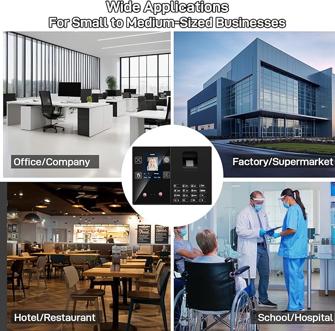 - ⭐Safe+Convenient Data Management & Wide Applications: Managers can easily view and download data reports or upload shift times and employees arrangements by USB flash drive (▲USB flash drive is Not included in the set and Recommended to use a FAT32 formatted USB flash drive). Not only this ensures the security and privacy of data transmission but also no need app or network. Ideal for small to medium-sized businesses within 1000 employees, widely used in offices, companies, factories, hotels, schools, restaurants, supermarkets, hospitals and more.