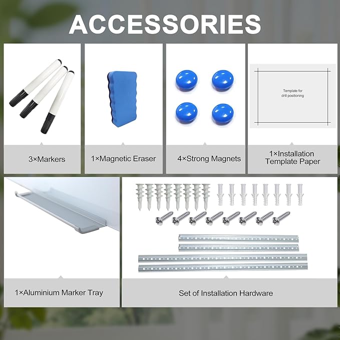 - ACCESSORIES INCLUDED – Measures 48" x 36". Comes with removable accessory tray, 1 Magntic Wraser,2 markers and 2 high power glass board magnets.