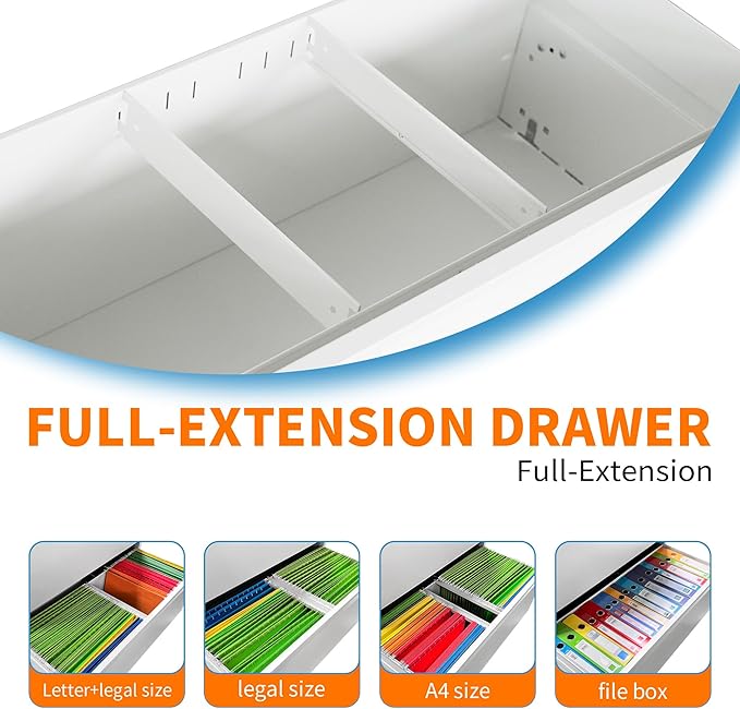 - 【Unique Design】 The steel file cabinet features precision ball bearing full suspension slides, ensuring silent and smooth opening and closing of the drawers. With a full extension drawer design and humanized handles, this locking cabinet offers convenient and effortless functionality.