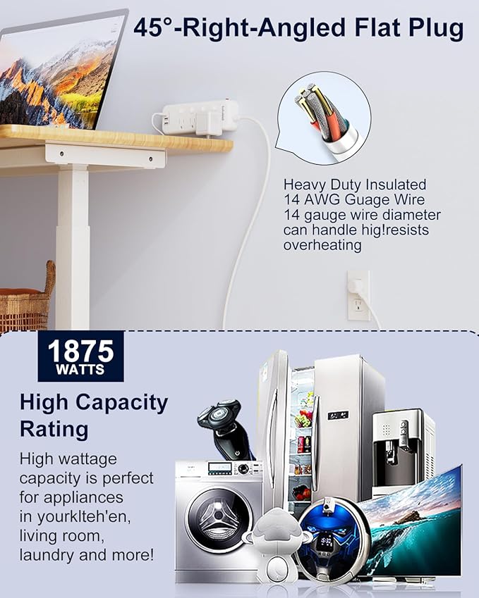 - 【Wall Mount Power strip】The heavy duty appliance extension cord has 2 mounting holes design allows you to securely install this kitchen power strip, including behind TV, workbench, garage, bedside, laundry room, or under desk/cabinet. The 15 amp extension cord suitable for the college dorm room, home, office, bedroom, kitchen, etc.