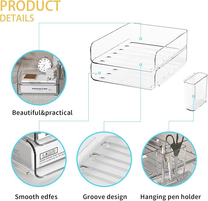 2-Tier Acrylic Paper Tray Organizer with Pen Holder | Clear Stackable Desk Organizer for Documents, Letters, A4 Paper | Modern Office/Classroom/Home Organization