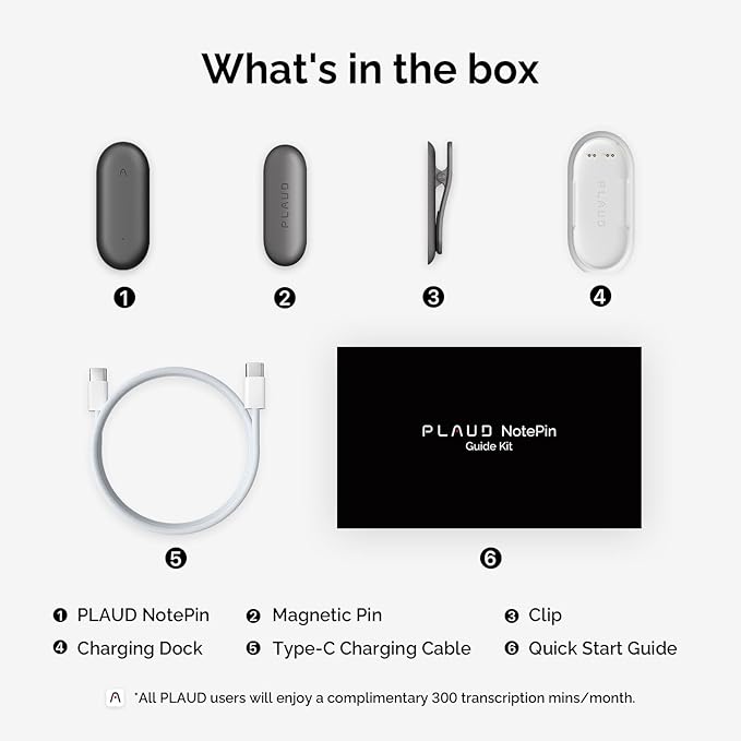 - EVERYTHING YOU NEED IS INCLUDED: 1 PLAUD NotePin Voice Recorder, 1 Magnetic Clip, 1 Charging Dock, and 1 USB-C Charging Cable. All PLAUD users will enjoy a complimentary 300 transcription mins/month. Additionally, you can configure Wi-Fi for automatic file uploads to PPC (while charging) and easily locate your NotePin using Apple’s Find My app.