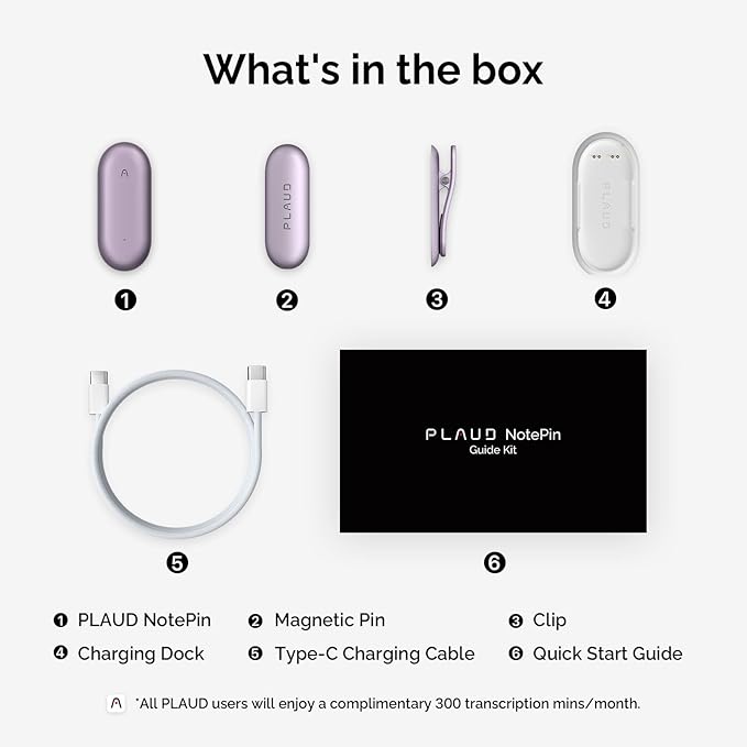 - EVERYTHING YOU NEED IS INCLUDED: 1 PLAUD NotePin Voice Recorder, 1 Magnetic Clip, 1 Charging Dock, and 1 USB-C Charging Cable. All PLAUD users will enjoy a complimentary 300 transcription mins/month. Additionally, you can configure Wi-Fi for automatic file uploads to PPC (while charging) and easily locate your NotePin using Apple’s Find My app.