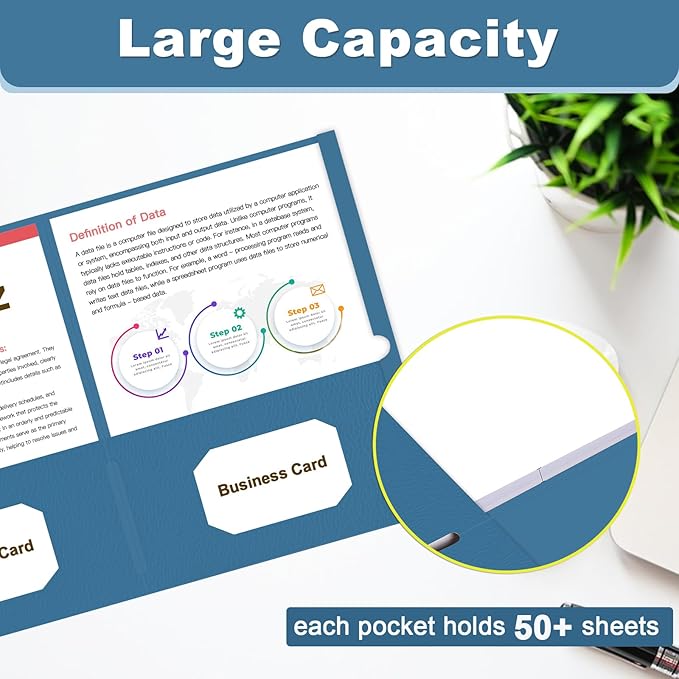 - Large Capacity: 60 pack pocket folder has two deep pockets that hold over 50 sheets of paper each. 2 business card slots for instant access to important contacts without the need for a separate business card holder.
