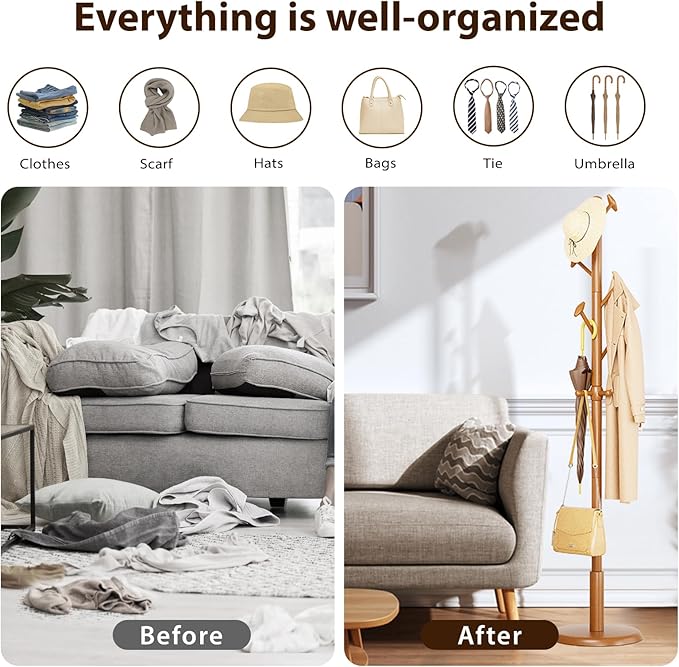 - Inspired by Natural Branches: The unique tree-shaped design allows you to incorporate natural design into your home. This freestanding coat rack features six 45-degree angled hooks to prevent your clothes from falling; the four lower hooks rotate smoothly for easy access