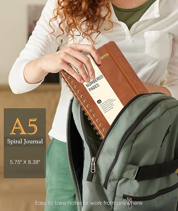 Lined Spiral Journal Notebook, A5 Hardcover Spiral Journals for Women Men, 150 Numbered Pages Spiral Bound Notebook, 100 GSM College Ruled Notebooks for Writing Note Taking 5.75" x 8.38", Brown