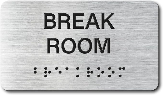 Break Room Signs with Raised Text & Grade 2 Braille, Brushed Aluminum/Silver Finish Easy Install with Double-Sided Tape, ADA Compliant Break Room Door Sign for Businesses & Offices