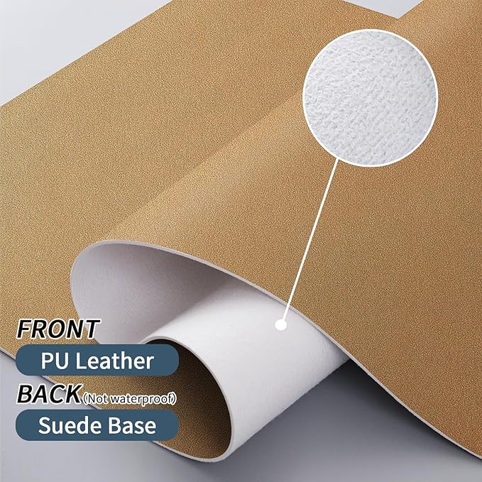 - 【Waterproof & Easy to Clean】The PU leather material desk mat is waterproof and heat resistant, easy to clean. It can perfectly protect your desktop from drinks, ink and other liquids. For cleaning, just wipe its surface stains with a damp cloth. Please note that its suede backing is not waterproof!