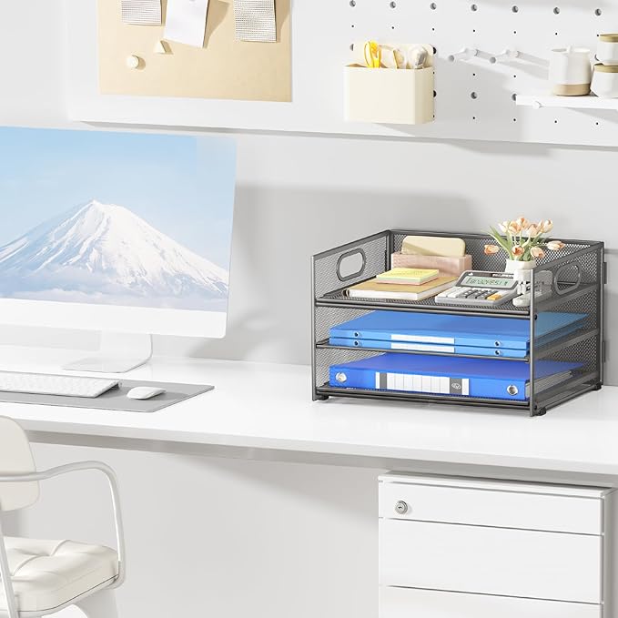 - Paper Organizer Function and Usage: The mesh desktop file organizer can hold various items including paper, folders, books, bills, notebooks, etc. The open design enables quick identification and access to contents, helping to declutter and organize the desk