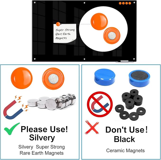 - COMPREHENSIVE ACCESSORIES SET: Comes with one 60" x 36" frameless tempered glass whiteboard, two markers, four magnets, one eraser and one marker tray for mounting. Pay special attention to the magnetism will not be strong due to the thickness of the glass, standard magnets do not work. Please use silvery super strong rare earth magnets. Don't use normal black magnet and fridge magnet.
