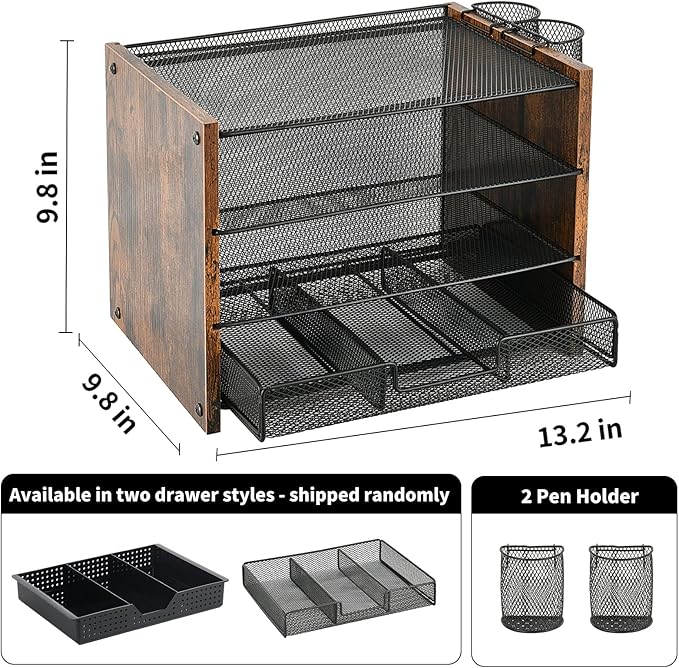 OPNCIE Desk Organizer and Accessories, 4-Tier Paper Letter Tray File Organizer with Drawer & 2 Pen Holder, Office Desk Accessories Workspace Desktop Organizer for Office Supplies(Brown)
