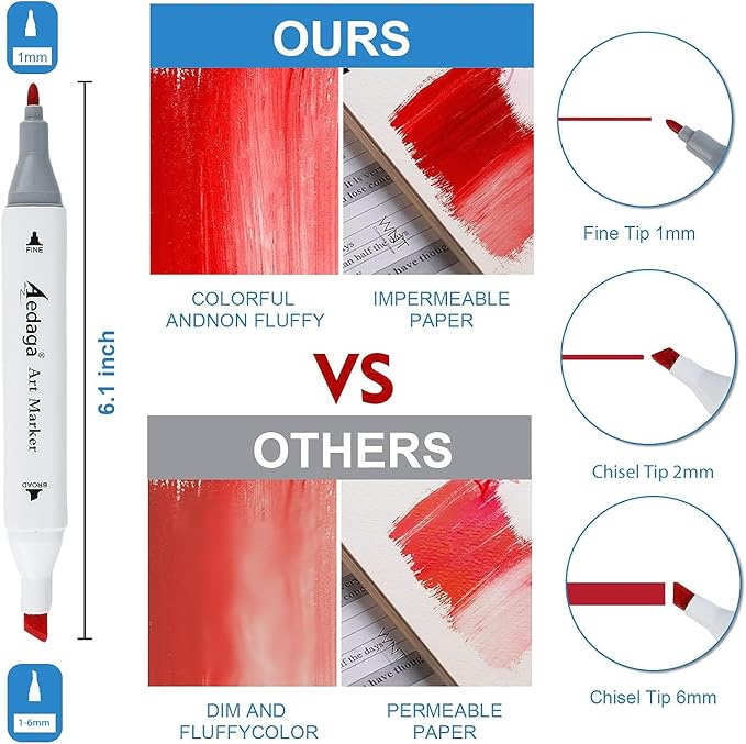 - Quick Drying and Durable: Our alcohol-based markers use alcohol as the solvent, which dries quickly. The Chisel tip of the dual marker is 6mm and the fine tip is 1mm.The drawing markers tip material is strong and durable.These alcohol markers for coloring have good ink that is colorful, non-fluffy, and can be used on non-permeable paper.