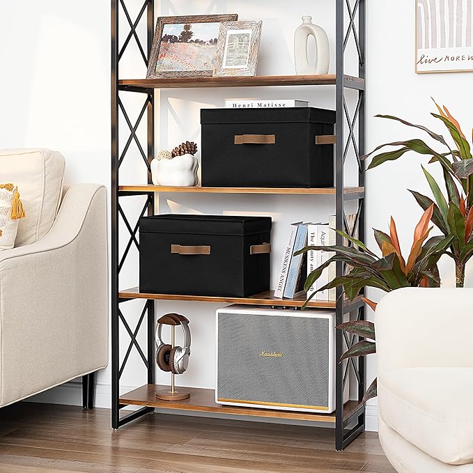 StorageWorks Fabric Storage Bins with Lid, Decorative Storage Boxes for Shelves, Stackable Closet Organizer Basket with Handles, Large, Black, 2-Pack