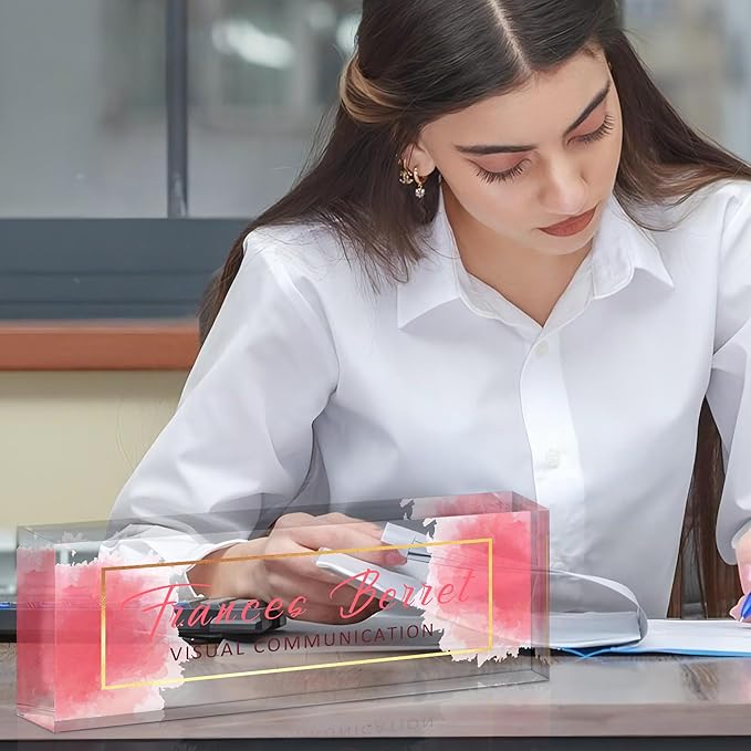 - [MADE IN USA] We're excited to present this personalized acrylic name plate designed specifically for office desks. You can choose your favorite style. click on the 'Customize Now' button and fill in details such as your name, title, company name, good wishes, or position. Ensure that you enter the correct text(paying attention to upper and lower case, full names, and abbreviations.) Once you've completed the customization, you'll receive a professional and beautiful name plate!