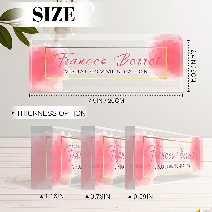 - Professional Customized Nameplate : We offer an extensive selection of designs. No matter what profession you're in, there's a matching style available. The acrylic nameplate measures 7.9 inches in length and 2.4 inches in height. It also comes in three different thicknesses: 0.59 inches, 0.79 inches, and 1.18 inches. This variety allows us to meet the needs of a large number of buyers.