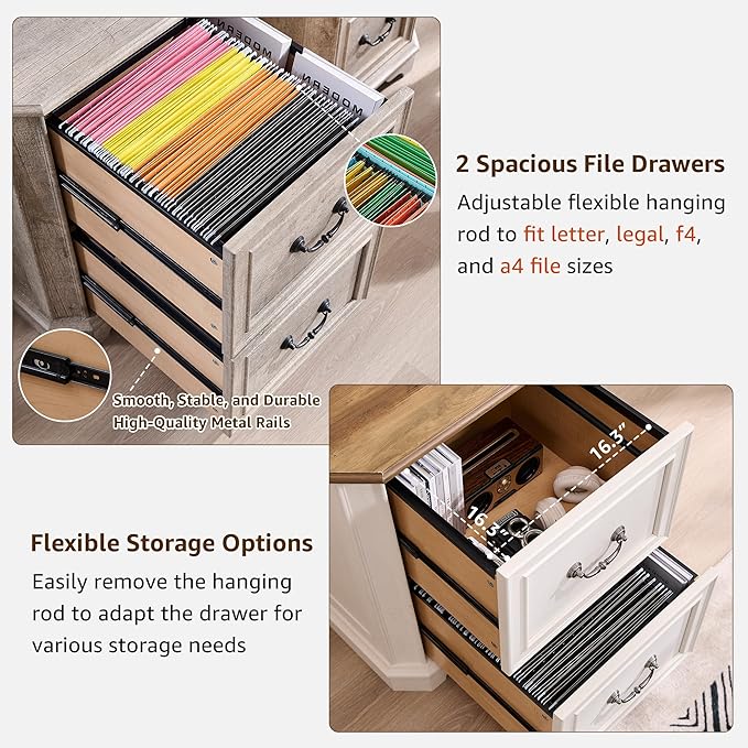 - 2 Spacious Drawers with Flexible Hanging Rods: The two large file drawers (16.3"L x 16.3"W x 10.2"D) include removable hanging rods, allowing you to organize Letter, Legal, A4, and F4 file sizes. Need extra storage? Simply remove the rods to transform the drawers into versatile compartments for clothing, accessories, or seasonal items. Smooth metal drawer slides ensure effortless opening and closing, while the interlock safety system prevents both drawers from opening simultaneously