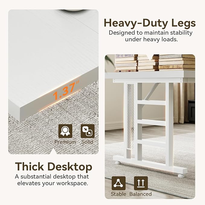 - 【Heavy-Duty, Sturdy Desk Frame for Durability】Built with a 1.37-inch thick engineered wood surface, this desk offers exceptional strength. The reinforced steel frame supports multiple monitors, printers, or heavy equipment. Adjustable leg pads keep your desk steady on uneven floors, ideal for home or writing desks.