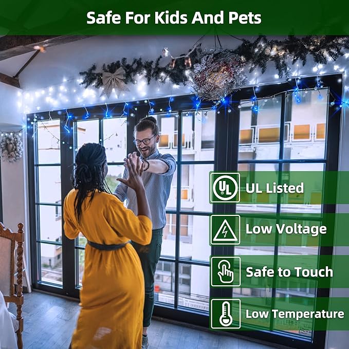 - Safe, Professional & Energy-Saving Indoors: UL-listed with a 29V low-voltage plug, these icicle lights are safe for kids and pets, staying cool to the touch even after hours of shining. Consuming 90% less energy than traditional bulbs, they save money while lasting up to 50,000 hours. Durable insulated wiring and sealed bulbs resist wear and moisture. Perfect for staircases, mantels, windows, or Christmas trees—bringing frosty elegance safely indoors