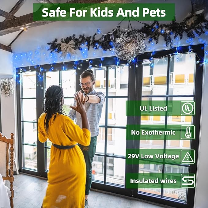 - Safe, Professional & Energy-Efficient: UL-listed and powered by a safe 29V low-voltage plug, these LED indoor icicle lights are safe for children and pets. They consume 90% less power than incandescent bulbs and last up to 50,000 hours. With insulated wiring and sealed bulbs, they stay cool and durable—perfect for staircases, mantels, bedrooms, and indoor Christmas décor where safety and elegance matter.