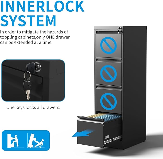 - 【Secure Locking System】This black file cabinet comes with one security lock and 2 keys, securing all your files. You can lock all the drawers at the same time, ensuring confidential documents and valuables remain protected from unauthorized access.Engineered with an anti-tilting mechanism, this narrow file cabinet allows only one drawer open at a time.The interlocking system enhances stability.