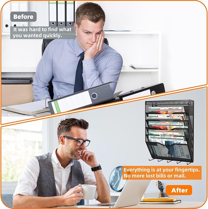 - Hanging Magazine Holder: 5+1 Magnetic Wall File Organizer, This versatile wall-mounted organizer features 5 vertical pockets for sorting documents, mail, recipes, and coupons, along with 5 convenient hooks for added storage. The top flat tray is perfect for keeping stationery and desk accessories organized. A sleek, space-saving solution for any workspace.