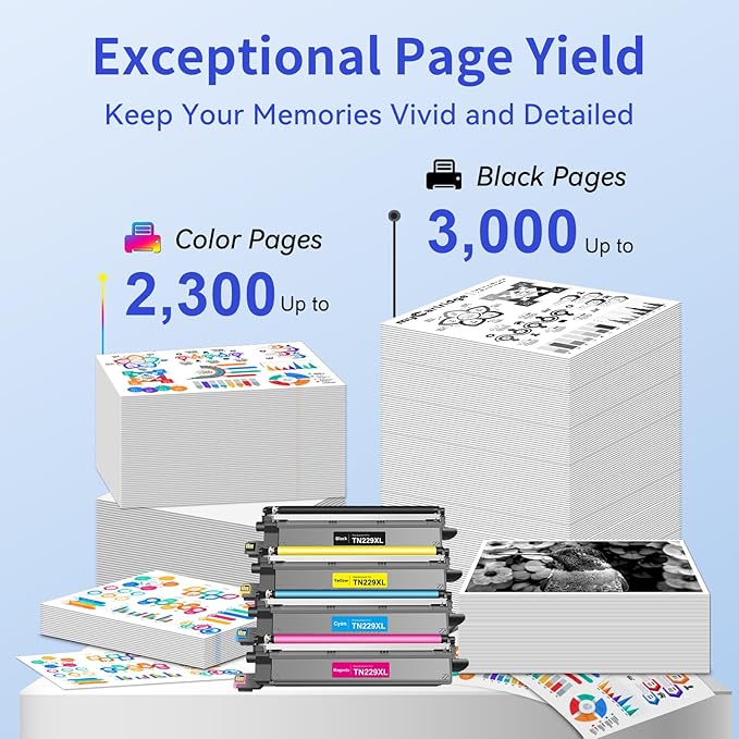 - Estimated High Page Yield:Up to 3,000 pages per TN229XLBK High Yield black toner, up to 2,300 pages per TN229 TN229XL cyan/magenta/yellow High Yield toner cartridges (based on 5% coverage)