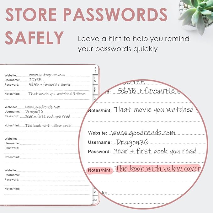 - NEVER FORGET A PASSWORD AGAIN: Almost every App. has a password, it is almost impossible to remember all the password log in details. This password book is specifically designed to help you create secure passwords and store all your passwords safely in one place. You will never forget your password log-in details again with this password keeper.