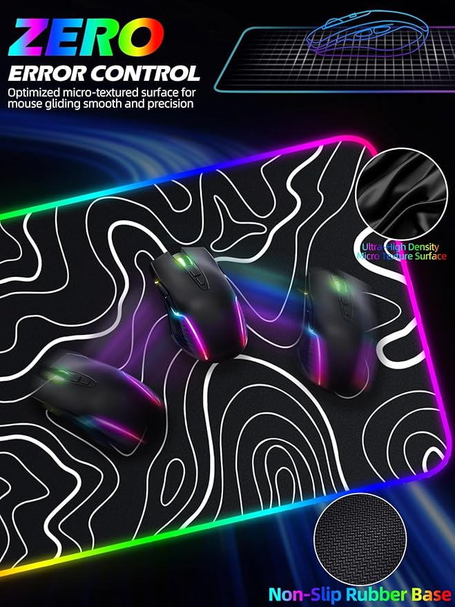 - 【Desk Mat with 11 RGB Lighting Modes】LED Mouse Pad designed with 11 different lighting modes - 2 dynamic modes and 11 static lighting modes; RGB Gaming Mouse Pad allows you to personalize your gaming setup. Choose your favorite color to create a visually stunning gaming experience. The power-off memory function can remember your last light mode choice. Awesome Cool Gaming Mousepad.