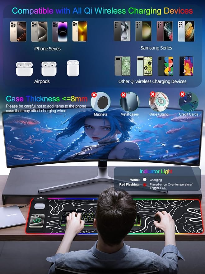 - 【Fast Charging Mouse Pad with Phone Holder】Gaming Mouse Pad has built-in 15W fast wireless charging function, which can conveniently charge your compatible devices without extra cables interfering with your desktop. Desk Mat compatible with iPhone 15/14/13/12/11/X/XR/XS/8 series; Samsung Galaxy S23/S22/S21/S20/S10/S9/S8/Note 9/8; Airpods 3rd/Airpods Pro 2nd/Airpods Pro and other Qi enabled devices. (Note: 15W need power adapter 9V 3A, and power adapter is not included with this Mousepad)