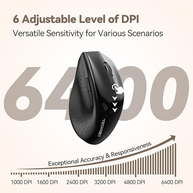 - 6-Level Adjustable DPI - The rechargeable mouse has 6 customizable DPI Settings (1000/1600/2400/3200/4800/6400), no matter you are in edit spreadsheet, image design, or a game, this rechargeable mouse can be seamlessly adapted to all of your requirements.