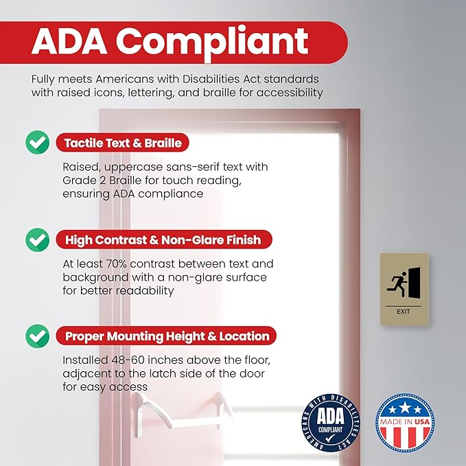 - ADA Compliant with Tactile Features – Features raised, uppercase sans-serif text with Grade 2 Braille, meeting ADA standards for accessible navigation.