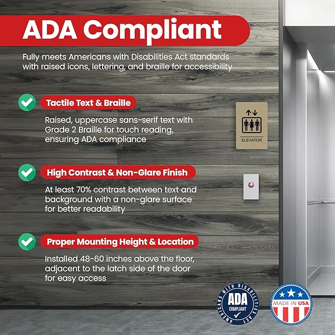 - ADA Compliant with Tactile Features – Features raised, uppercase sans-serif text with Grade 2 Braille, meeting ADA standards for accessible navigation.