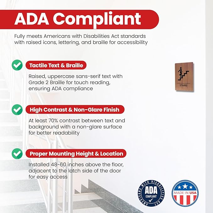 Promot Stair Sign – ADA Braille Stairway Sign for Business, Self-Adhesive, 9" x 6", Commercial Door Signage, Office Wall Decor - Chestnut