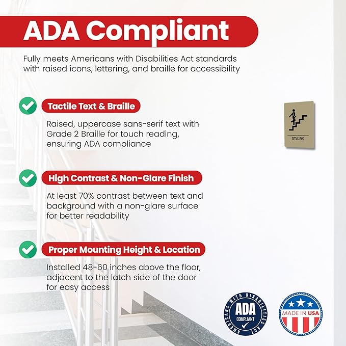 - ADA Compliant with Tactile Features – Features raised, uppercase sans-serif text with Grade 2 Braille, meeting ADA standards for accessible navigation.
