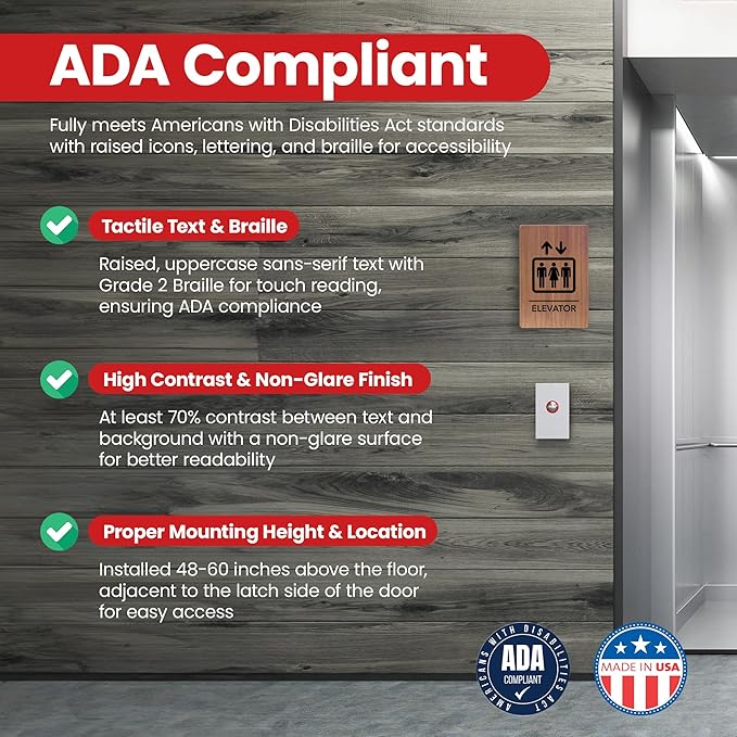 - ADA Compliant with Tactile Features – Features raised, uppercase sans-serif text with Grade 2 Braille, meeting ADA standards for accessible navigation.
