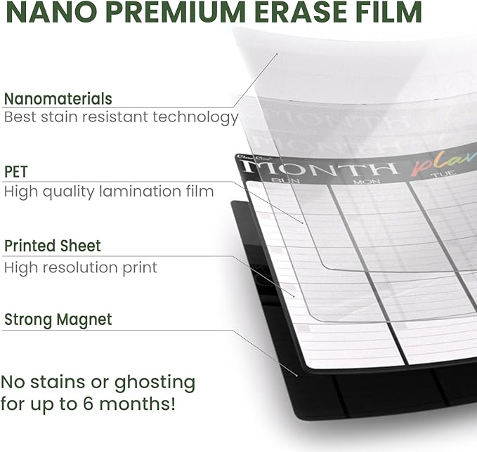 - Erases easily - Our calendars use premium nano erase film, making it incredibly easy to wipe off notes, even those that have been written for a long time. No residue, no fuss.
