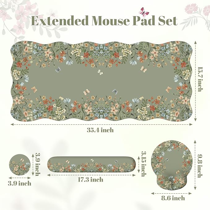 - 4 in 1 Desk Mat Set: The extra large mouse pad 35.4" x 15.7", wrist rest for computer keyboard 17.32" x 3.15" , wrist support mouse pad 10.6" x 8.8" , coaster:3.93" x 3.93". You can use the whole set, combine them as you like, or lift it to a few others